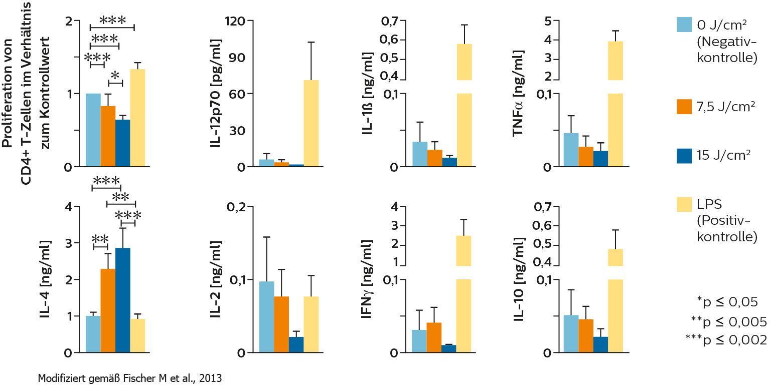 Blaues LED-Licht ist in der Lage Immunzellen, z.B. T-Zellen und dendritische Zellen, zu deaktivieren und somit die Freisetzung von Zytokinen zu reduzieren. Dieser Effekt durchbricht den Teufelskreis von selbstverstärkenden Entzündungsprozessen bei Psoriasis vulgaris.
