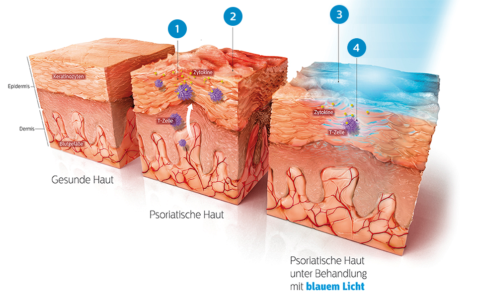Wenn Keratinozyten blauem LED-Licht mit einer Wellenlänge von 453 nm ausgesetzt werden, nimmt deren Vermehrung ab und die Differenzierung zu. Dies wirkt der Hyperproliferation von Keratinozyten in psoriatischer Haut entgegen.