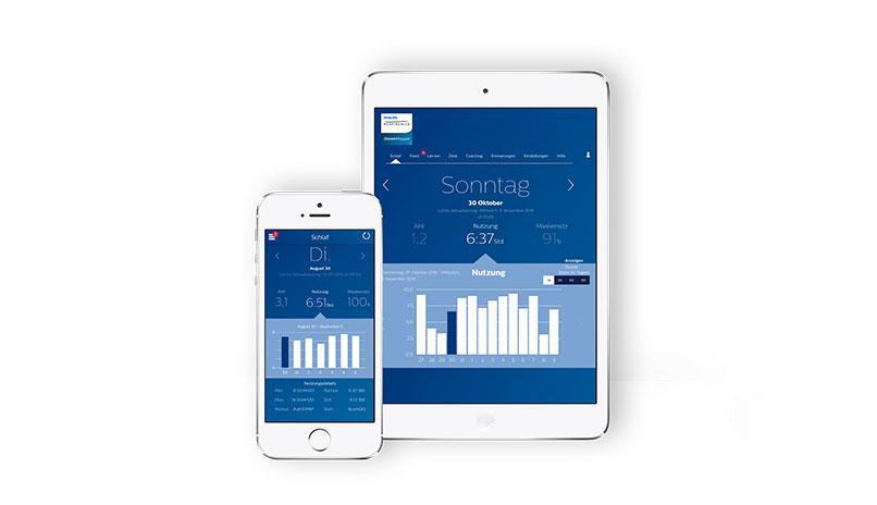 DreamMapper* ist als App und als webbasierte Anwendung verfügbar, mit der Sie immer und überall über die Therapie Ihres Kindes informiert sein können. Sie können Informationen zu Themen wie Maskensitz und Therapiedauer abrufen und sich eine Vielzahl an Videos als Hilfestellung zur Nutzung von Maske und Therapiegerät ansehen.