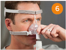 Ziehen Sie die Maskenhalterung zum Anlegen über Ihren Kopf und setzen Sie das Kissen vorsichtig über Ihre Nase.